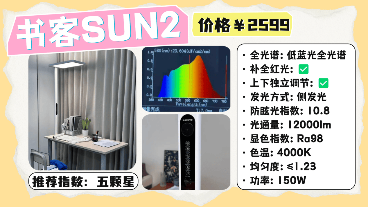 书客是一款无眩光的护眼大路灯,其采用的是与美国普瑞Bridgelux联合定制的SunSilk Pro™类太阳全光谱灯珠,通过精密的光学排列以及SunShell360°立体光场,从光源源头开始科学调控每一束光线,每颗灯珠在发光时都会被精准控制,使整体光谱尽可能接近自然光,最大程度降低对视网膜的短波刺激。此外书客sun2还采用了全光域防眩光技术4.0,实现了UGR<10.8超低眩光等级,即使在「直视光源」的情况下,光线依然柔和均匀,用眼舒适度提升高达87%。
