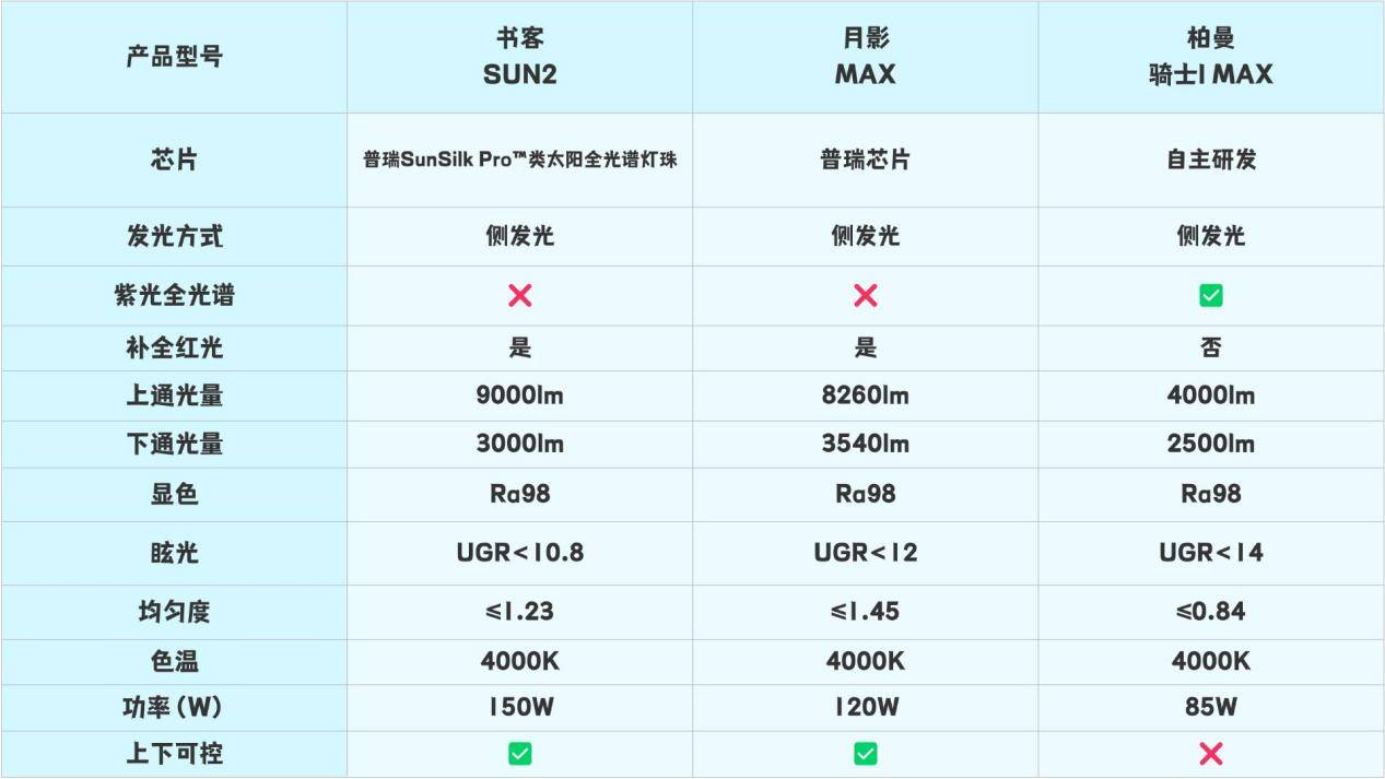 月影护眼灯值得买吗?接下来我将对书客SUN2、月影MAX、柏曼骑士I Max这三款护眼大路灯的品牌背景、全光谱、防眩光以及显色指数四大维度进行详细分析。