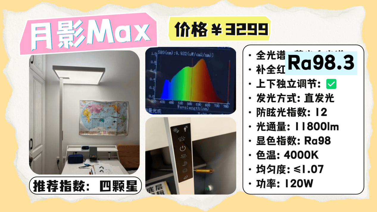 月影实测显色指数在Ra98.5左右,整体的还原色彩真实,对于读写、画画场景都能够满足。